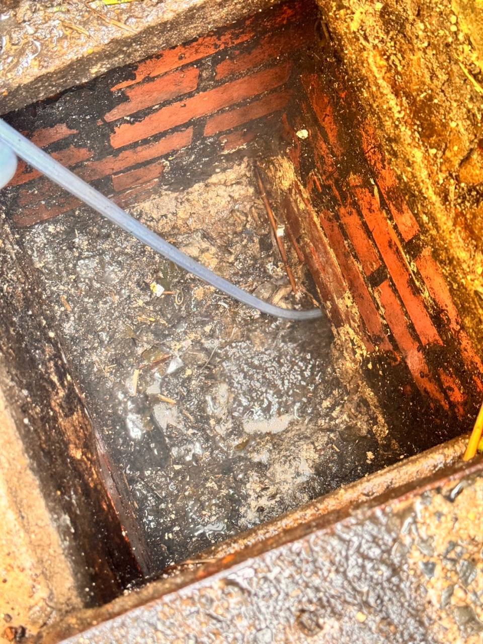 市の本管まで全ての排水管に脂が詰まっており、ここまでいくと排水の高圧洗浄(洗管作業)を行わないと、脂の除去は不可能でした。